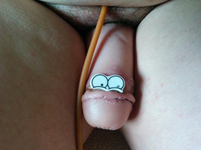 The results point to a stricture far thicker than anyone had anticipated, and I end up staying an extra week to have a cystoscopy done, revealing a solid wall of scar tissue in my urethra, right at the join where the original urethra ended and the new lengthened one began. I’m given a suprapubic catheter, to remain in until the next possible surgery date Dr. Crane has available.