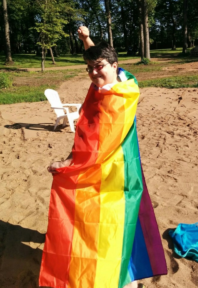 In the pic I’m talking about, I’m in a perfect superhero pose: hands on hips, head thrust back, huge smile, in the exact body I want, with that rainbow flag behind me as a cape.